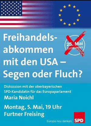 Über Inhalt und Form der Verhandlungen informiert und diskutiert die SPD am Montag, 05. Mai 2014, um 19.00 Uhr im Furtner in Freising. Zu Gast ist die oberbayerische SPD-Europaspitzenkandidatin Maria Noichl.